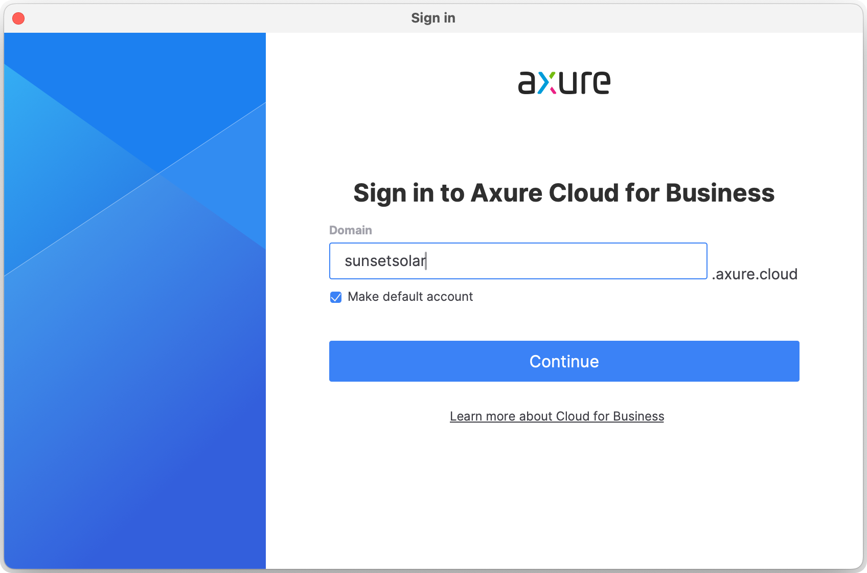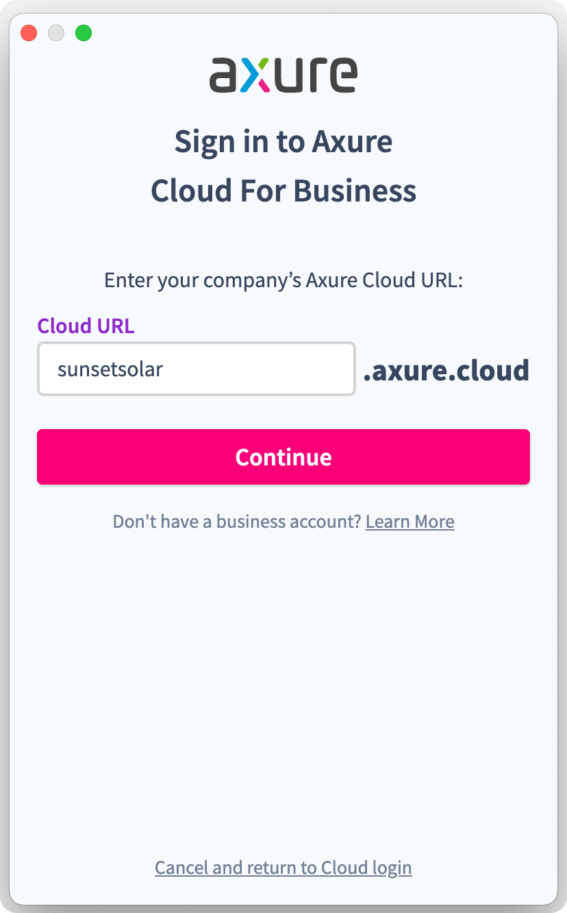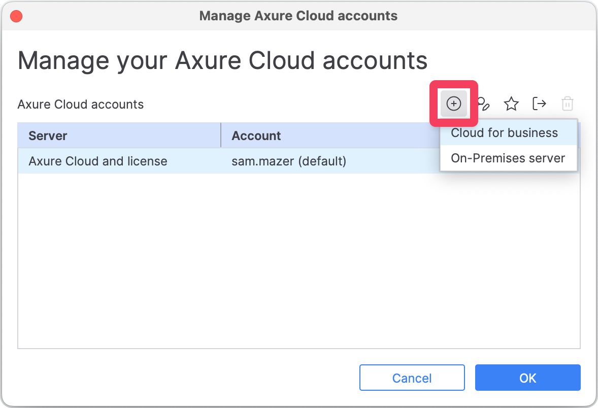 button and select the Axure Cloud for Business solution your team uses:- Cloud for Business for private instances hosted on Axure servers