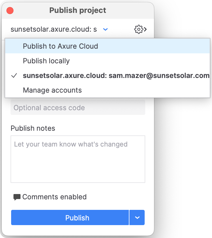 You can publish to any server location you've saved in Axure RP. To switch between locations, go to Publish → Publish to Axure Cloud and click the dropdown at the top of the Publish Project dialog.
