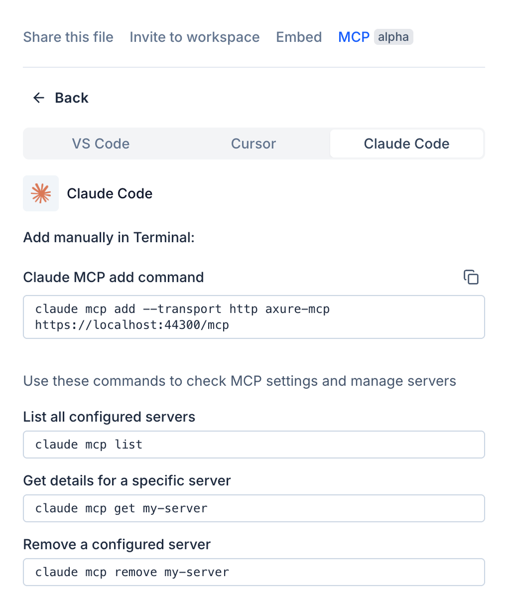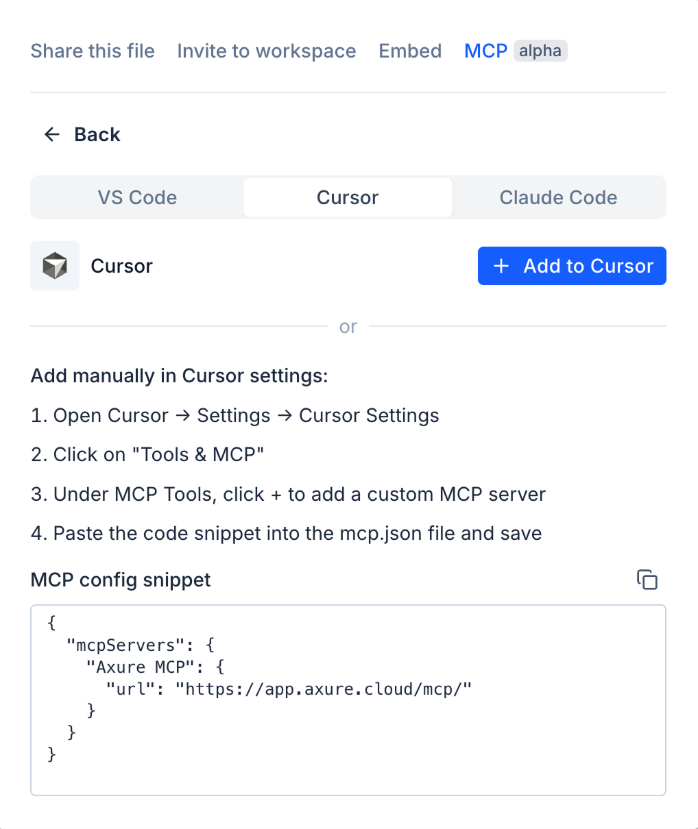 MCP stands for Model Context Protocol, an open standard for giving AI agents and tools access to external data sources. Any agent or tool that supports MCP can use Axure Cloud as a context source via the MCP server URL. The Share dialog includes setup instructions for Claude Code, VS Code, and Cursor.