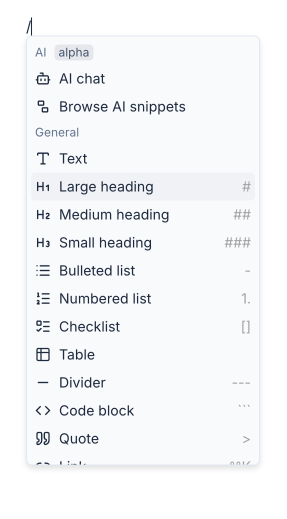 The document editor is built around blocks. Every paragraph, heading, list, and embed is its own block. To change a block's type, click the block handle (the ⋮⋮ icon that appears to the left of a block when you hover), or use slash commands.