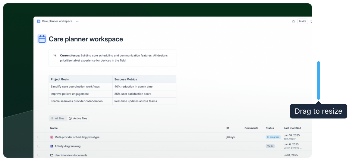 Every whiteboard includes a document, a live collaborative text editor that sits alongside the canvas. You can also create standalone documents without a canvas, which are useful for PRDs, meeting notes, knowledge bases, and other written content that doesn't need visual diagrams.