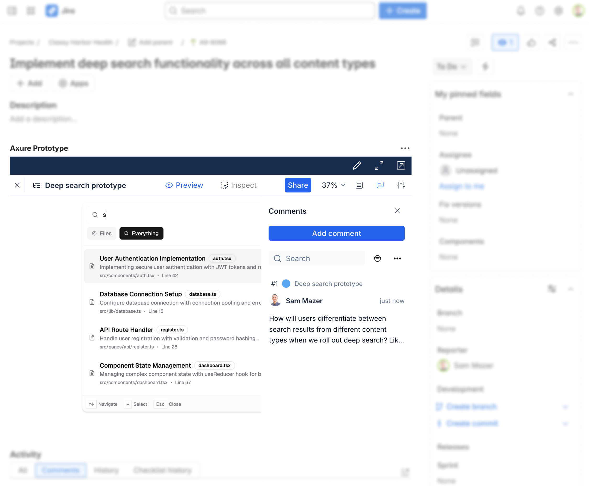 You can embed Axure Cloud prototypes directly into Jira work items or Confluence pages to give your team full context while they review work. Once embedded, the prototype is fully interactive and allows commenting right from within the ticket.