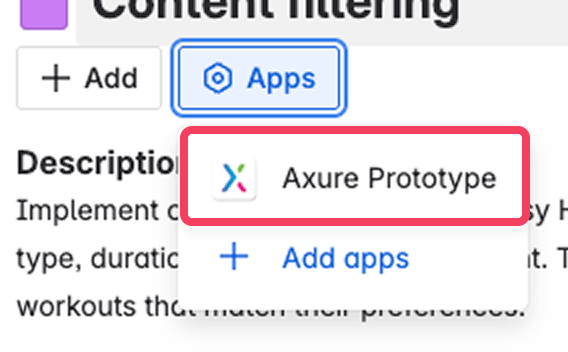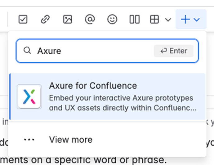 Click Apps > Axure Cloud Link at the top of the Jira ticket or Insert elements and search for Axure for Confluence in the toolbar of the page editor.