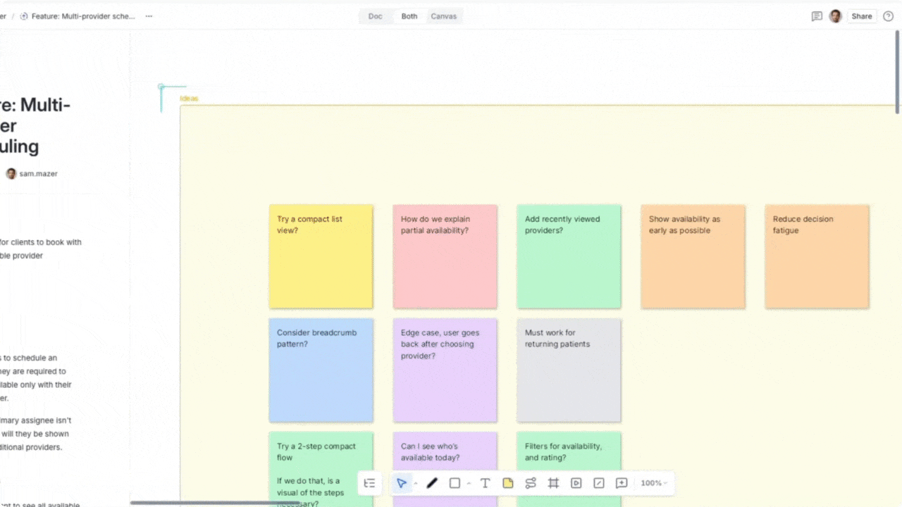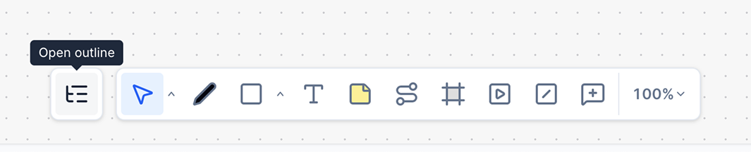 The Outline pane shows a hierarchical list of every object on the canvas, sections, groups, frames, shapes, connectors, and more. Use it to navigate, select, rename, reorder, and organize objects without having to find them on the canvas directly. Selection in the Outline stays in sync with the canvas: selecting an object in one updates the other.