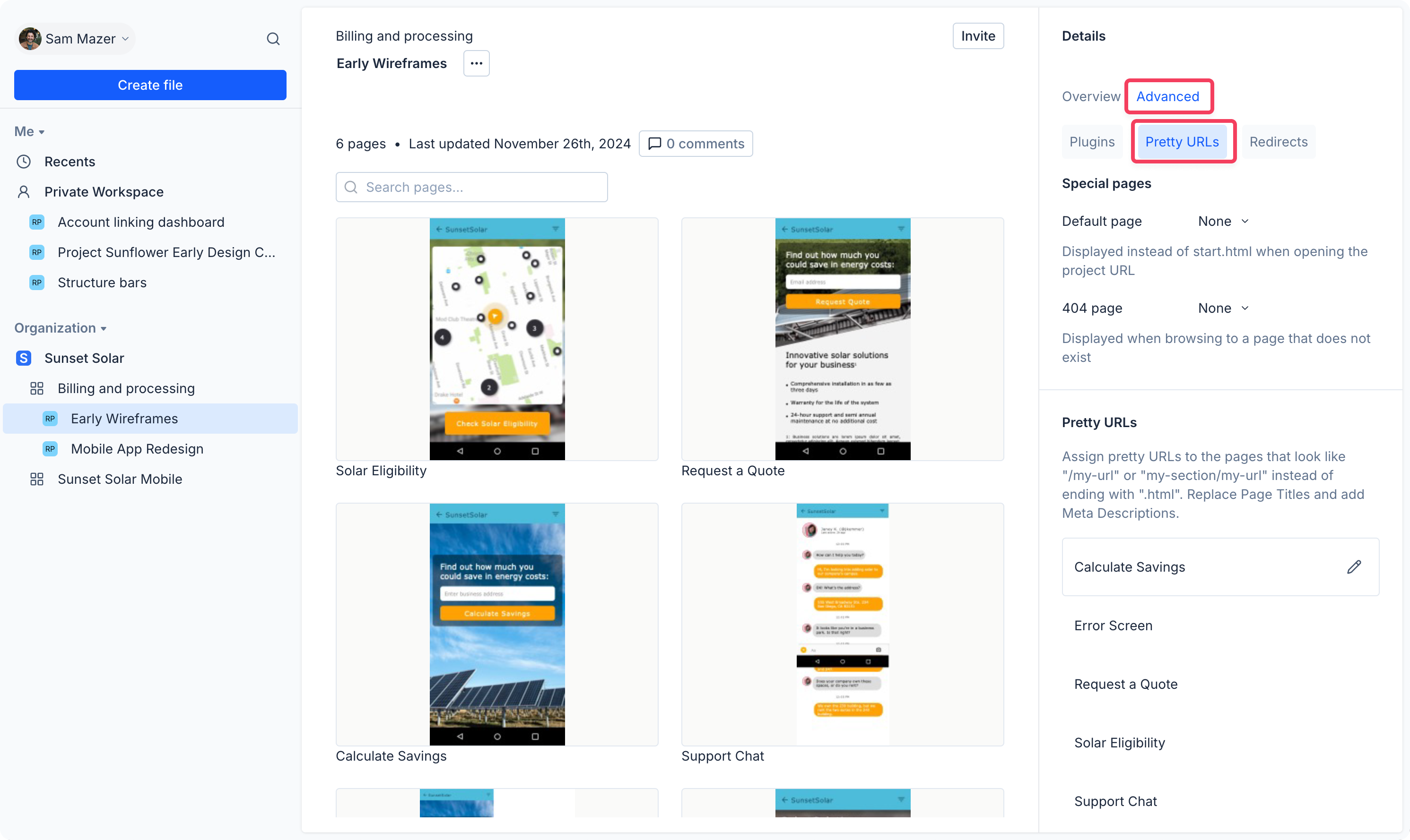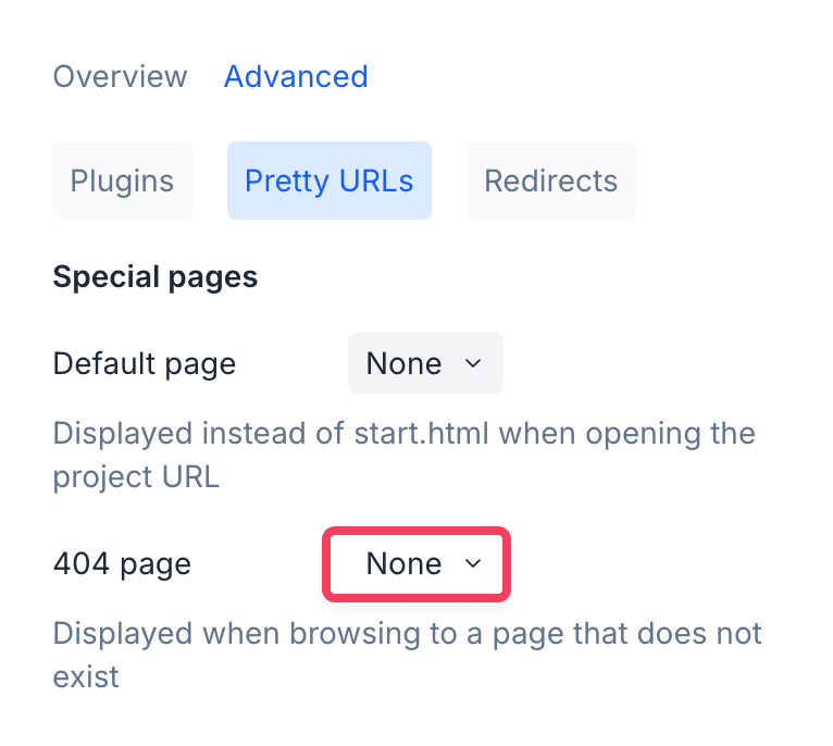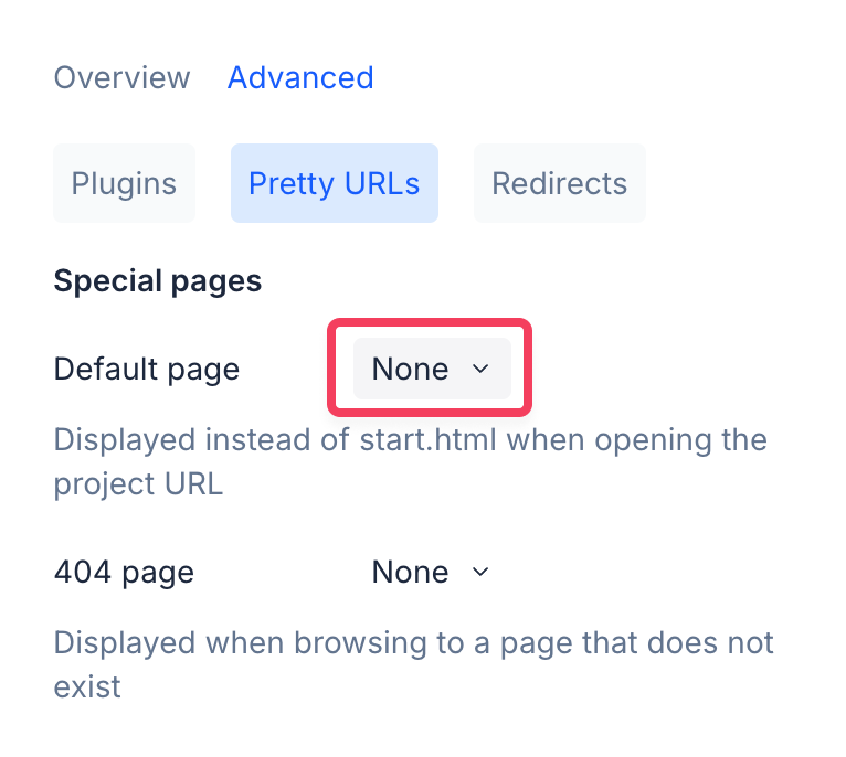 Pretty URLs allow you to customize and simplify the URL for specific pages, so that a URL leading to a specific project page will end with "/my-url" or "my-section/my-url" instead of ending with “.html”. Once you open a project’s overview page in Axure Cloud, you can select the Advanced tab to find options for adding in plugins, pretty URLs, and redirects.