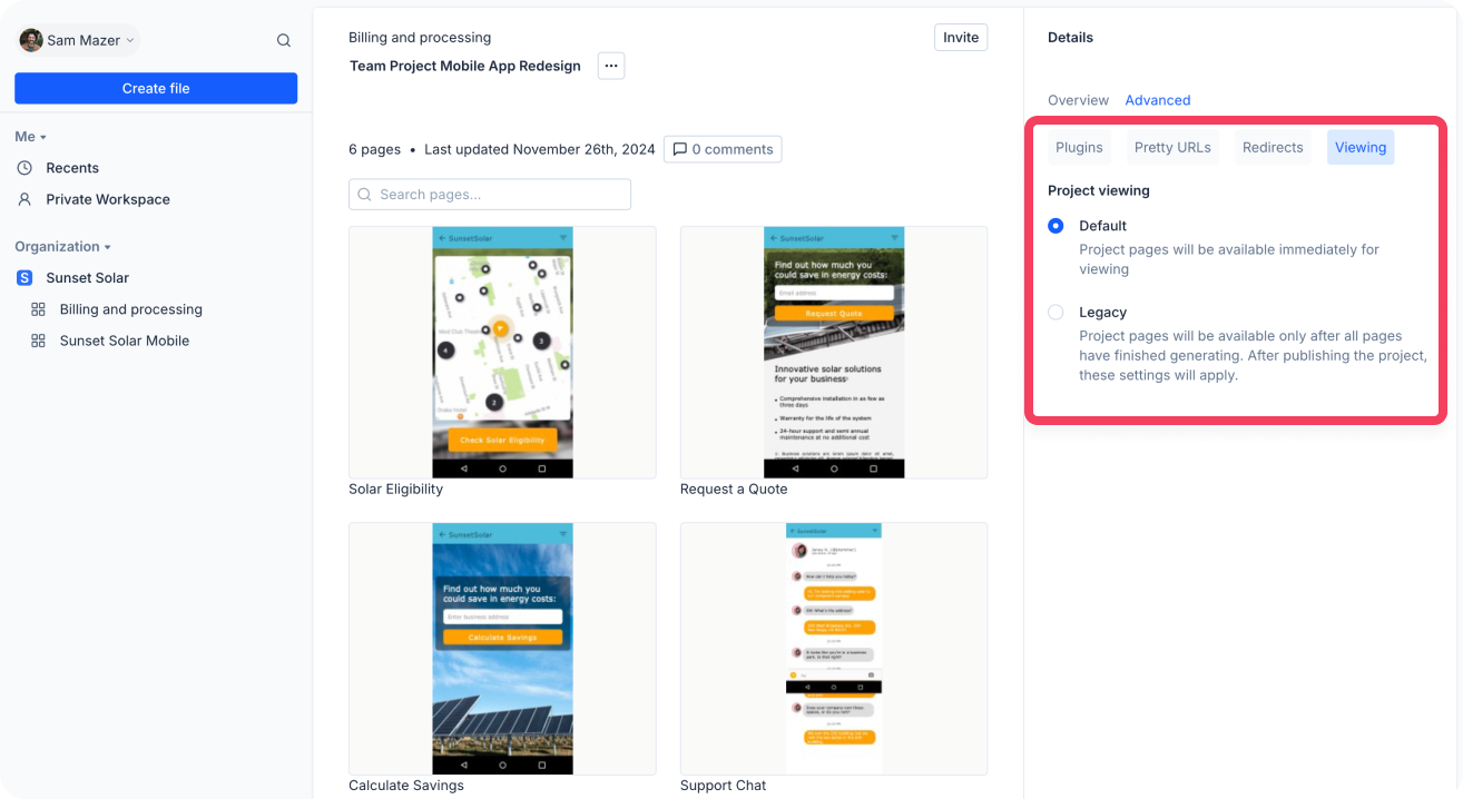 With the Legacy setting on, all project pages will be generated when published, but the share link will only be viewable after all pages have been generated.