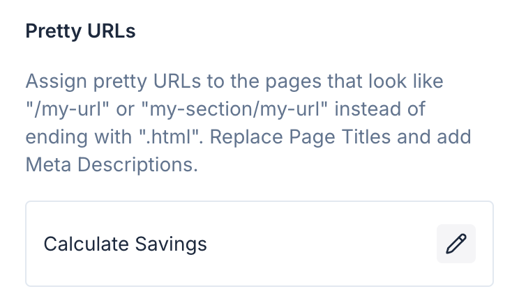 To assign a pretty URL to a page, scroll down to the list of the project pages, and then select the Edit button ✏️