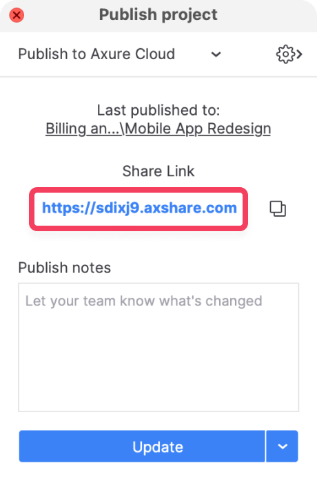 When you publish an Axure RP file to Axure Cloud, you're given a publicly shareable link to the file's generated HTML. You can view this link at any time in the Publish → Publish to Axure Cloud menu in Axure RP and in your list of projects at app.axure.cloud.