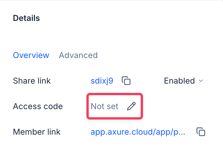 You can also add or edit a project access code in Axure Cloud by navigating to the project Overview page. In the Details pane on the right, click the Edit button ✏️