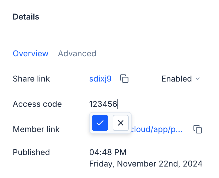 Once you set an access code, you can copy the share link with a hashed version of the access code embedded in the link.