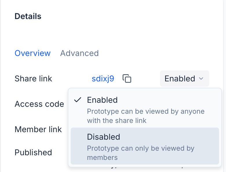 To disable a project's share link, go to the project's Overview screen at app.axure.cloud. In the right-side panel, locate the Share link. Click the Enabled dropdown next to the link, and select Disabled.