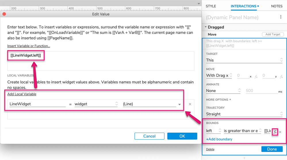 , means that the dynamic panel's left edge can only move to X values that are greater than or equal to the X value of the line widget's left edge. In other words, it cannot move any farther left on the page than the line widget's left edge.