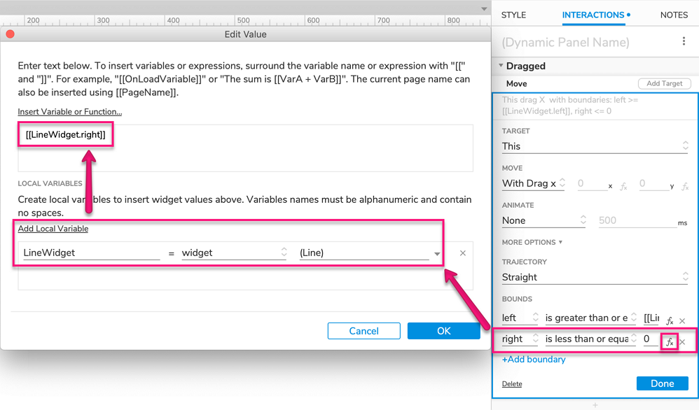 , means that the dynamic panel's right edge can only move to X values that are less than or equal to the X value of the line widget's right edge. In other words, it cannot move any farther right on the page than the line widget's right edge.