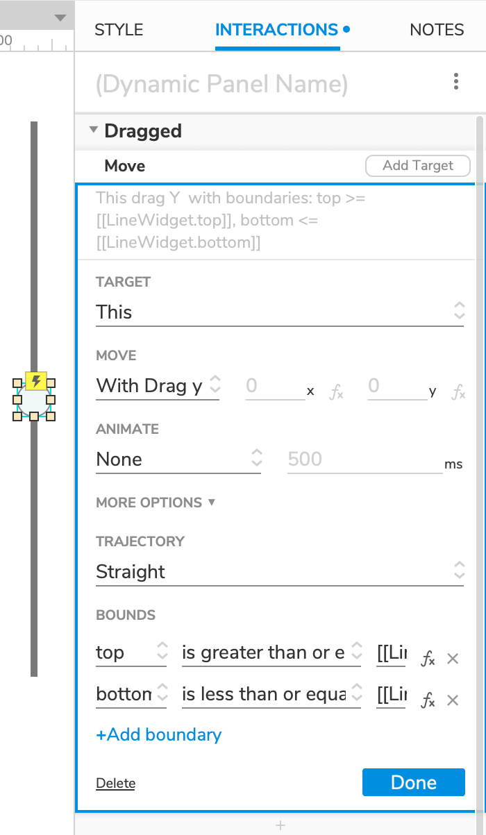 In the Move dropdown, select With Drag x. This will make the dynamic panel follow the cursor along the X (horizontal) axis as you drag it in the web browser.