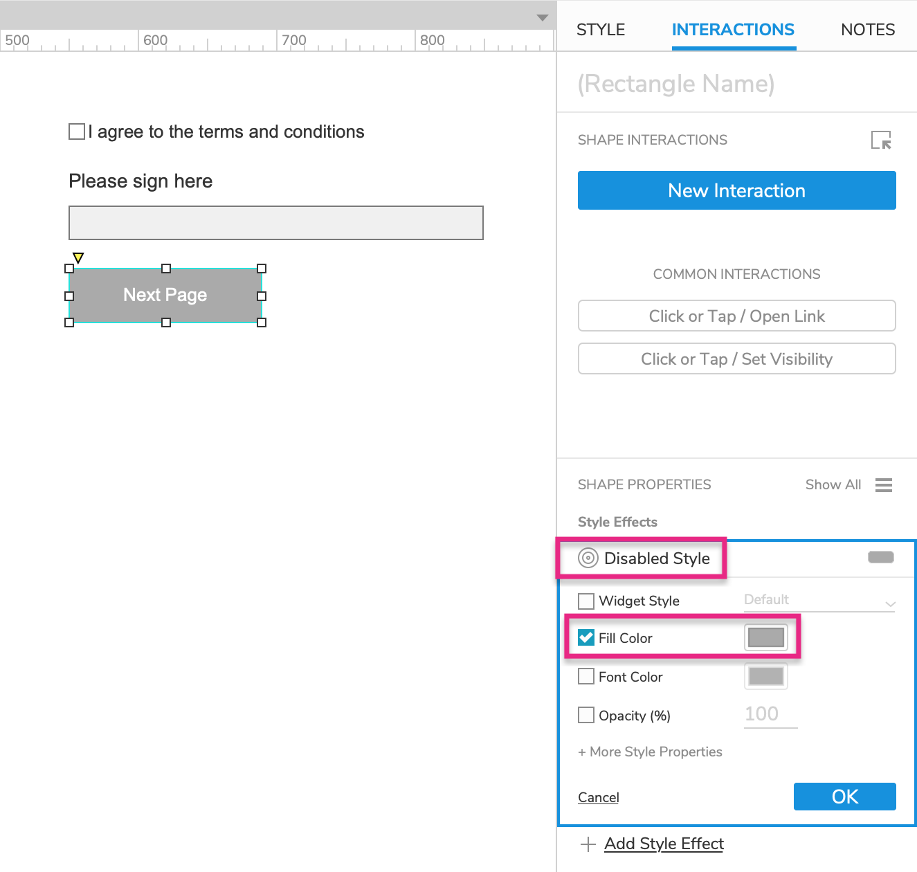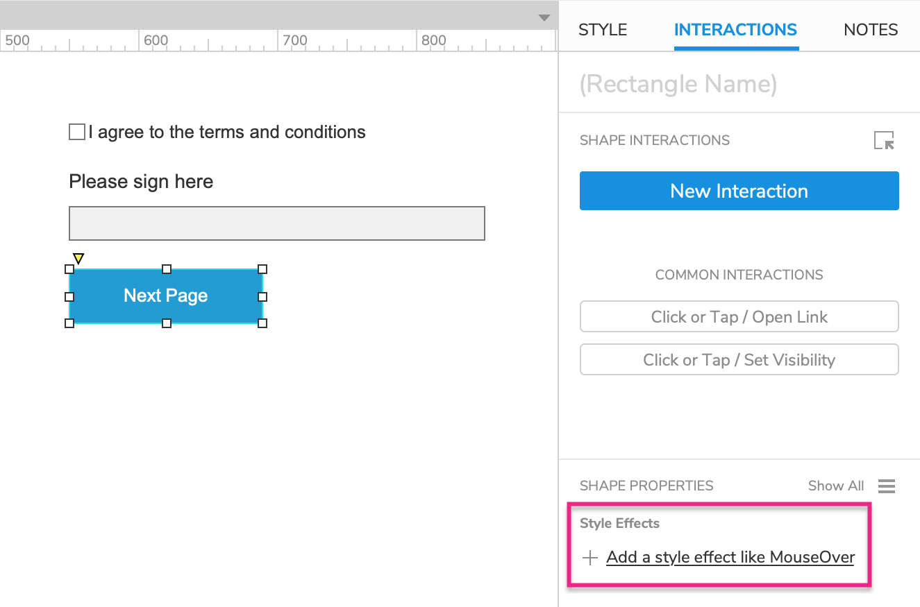 With the button widget still selected, click Add a style effect in the Interactions pane.