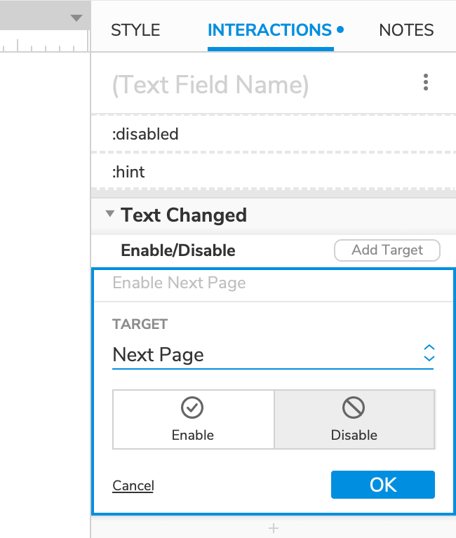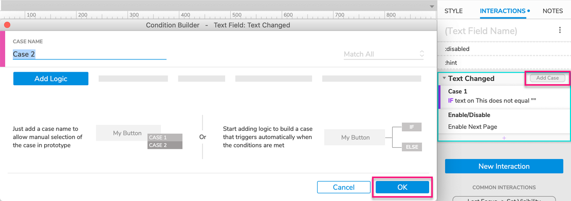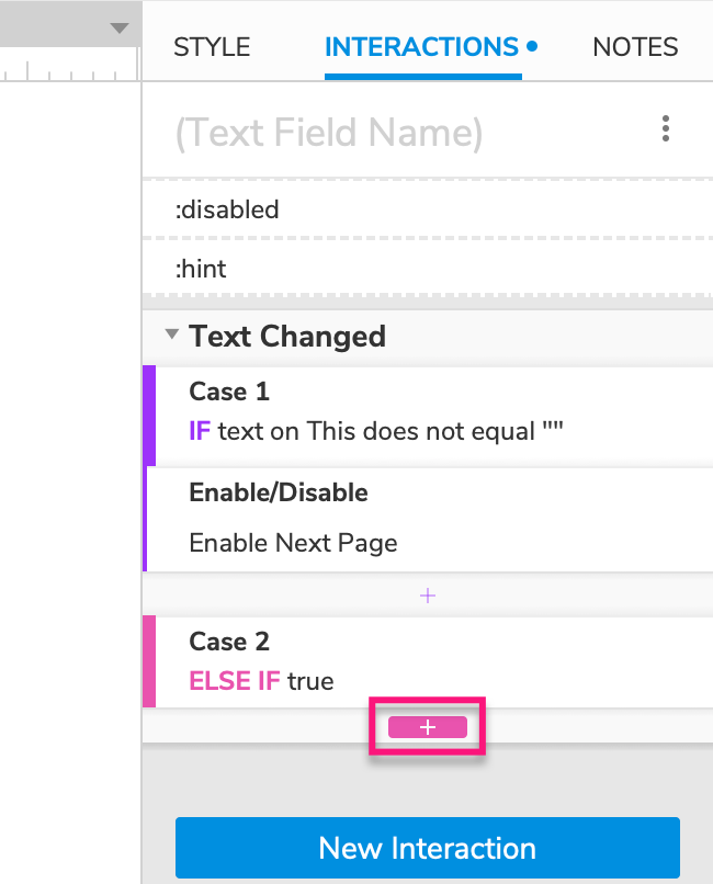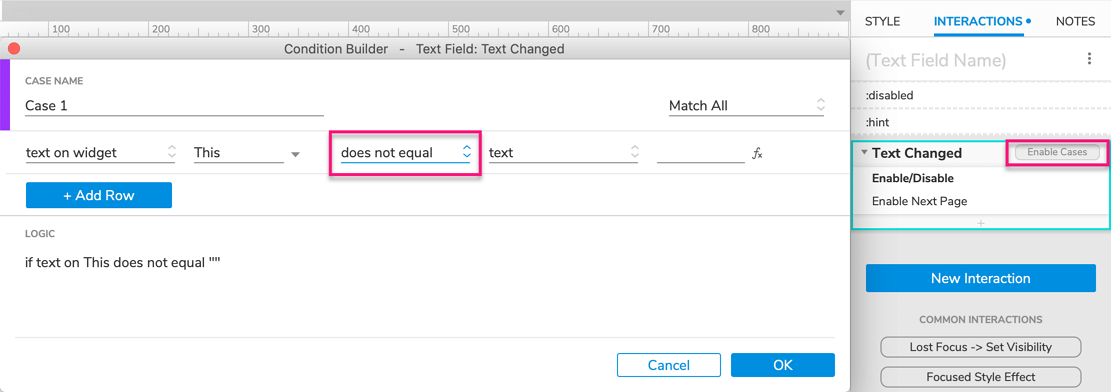 With the text field still selected, hover over the Text changed heading in the Interactions pane and click Enable cases to the right.