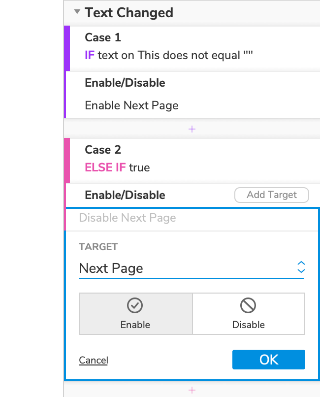 Select the Text changed event in the list that appears, and then select the Enable/disable action.