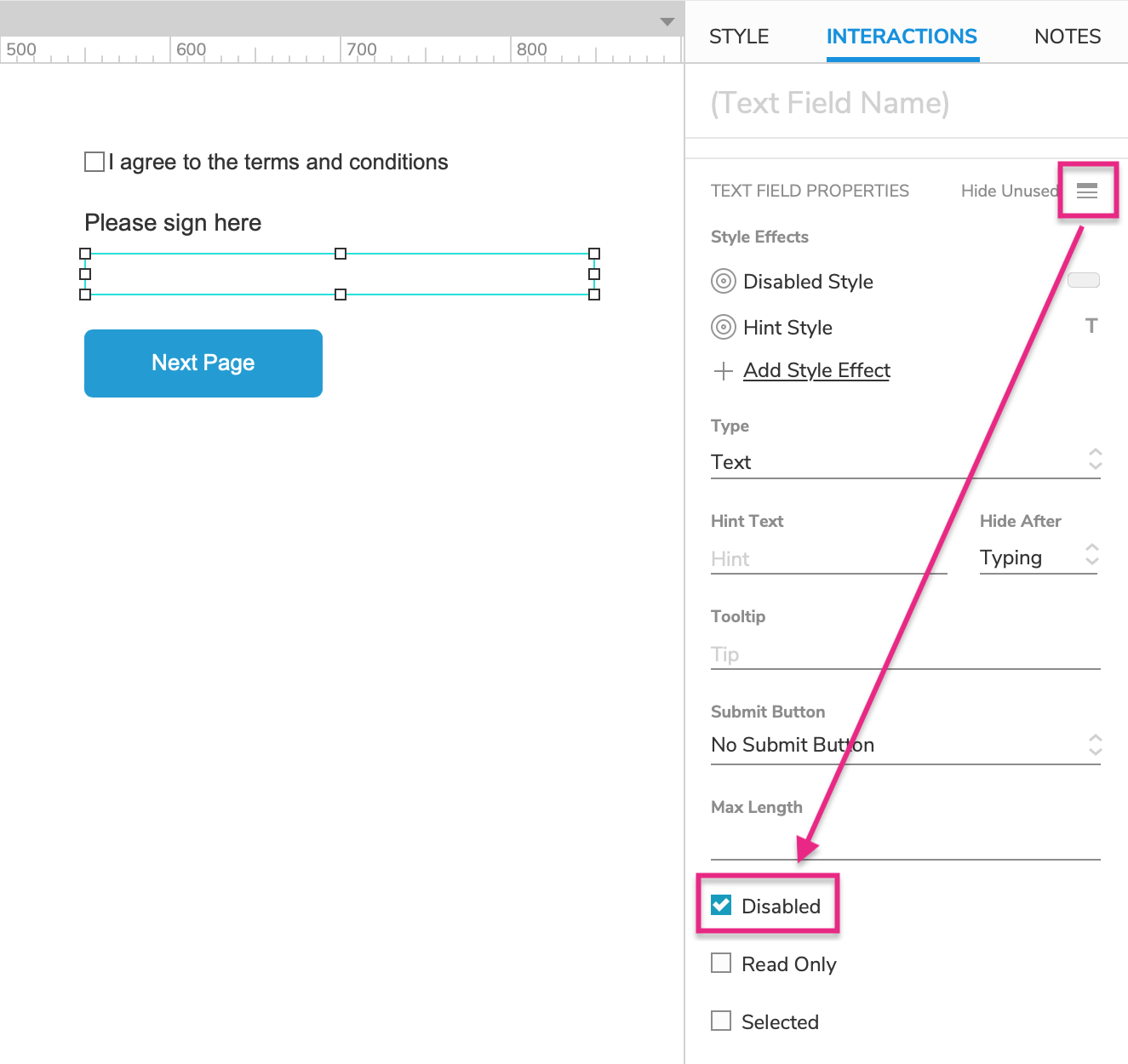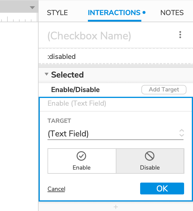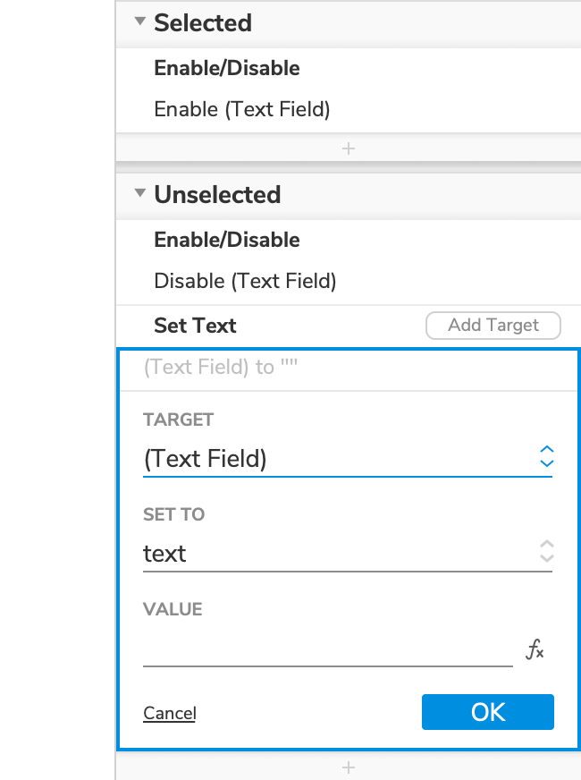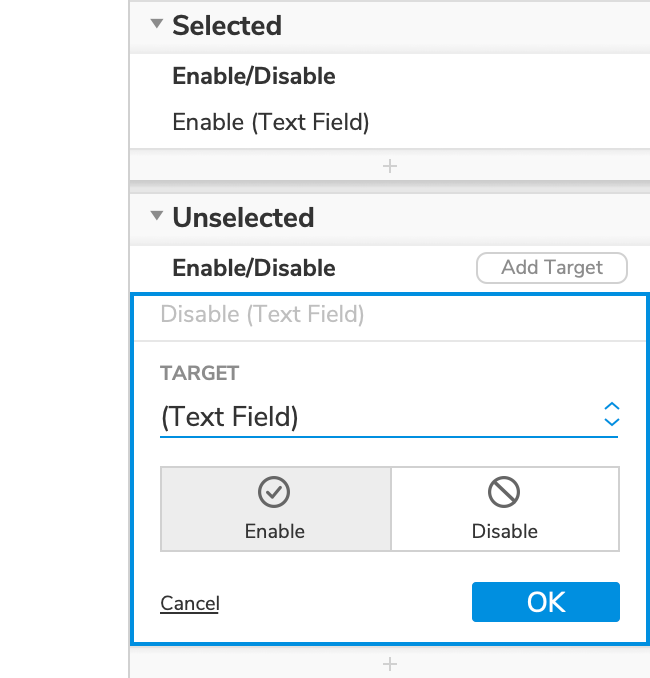 Select the text field widget in the Target dropdown, and then select Disable below it.