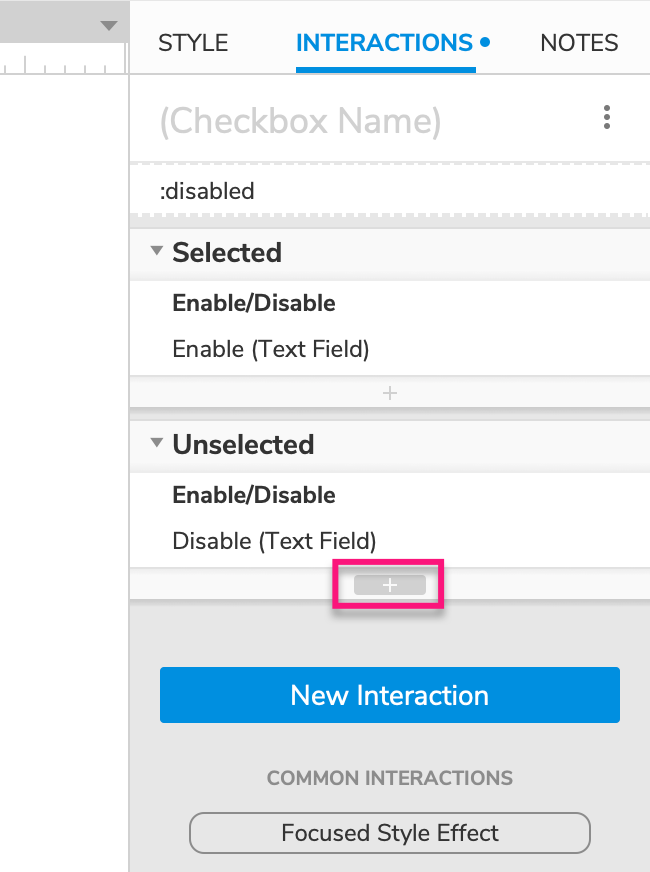 With the checkbox widget still selected, click New interaction in the Interactions pane once again.